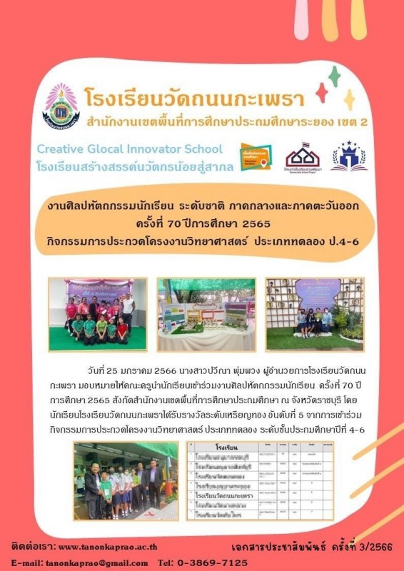 3/2566 ผลการแข่งขันโครงงานวิทยาศาสตร์ ประเภททดลอง งานศิลปหัตถกรรมปี 65
