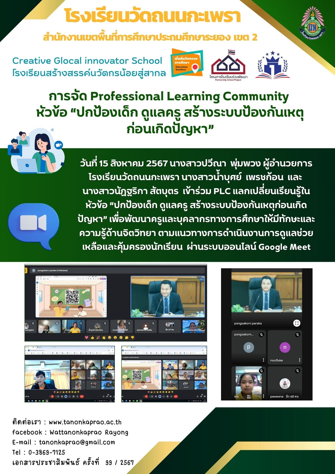 15 ส.ค. 67 การจัด Professional Learning Community หัวข้อ “ปกป้องเด็ก ดูแลครู สร้างระบบป้องกันเหตุก่อนเกิดปัญหา”