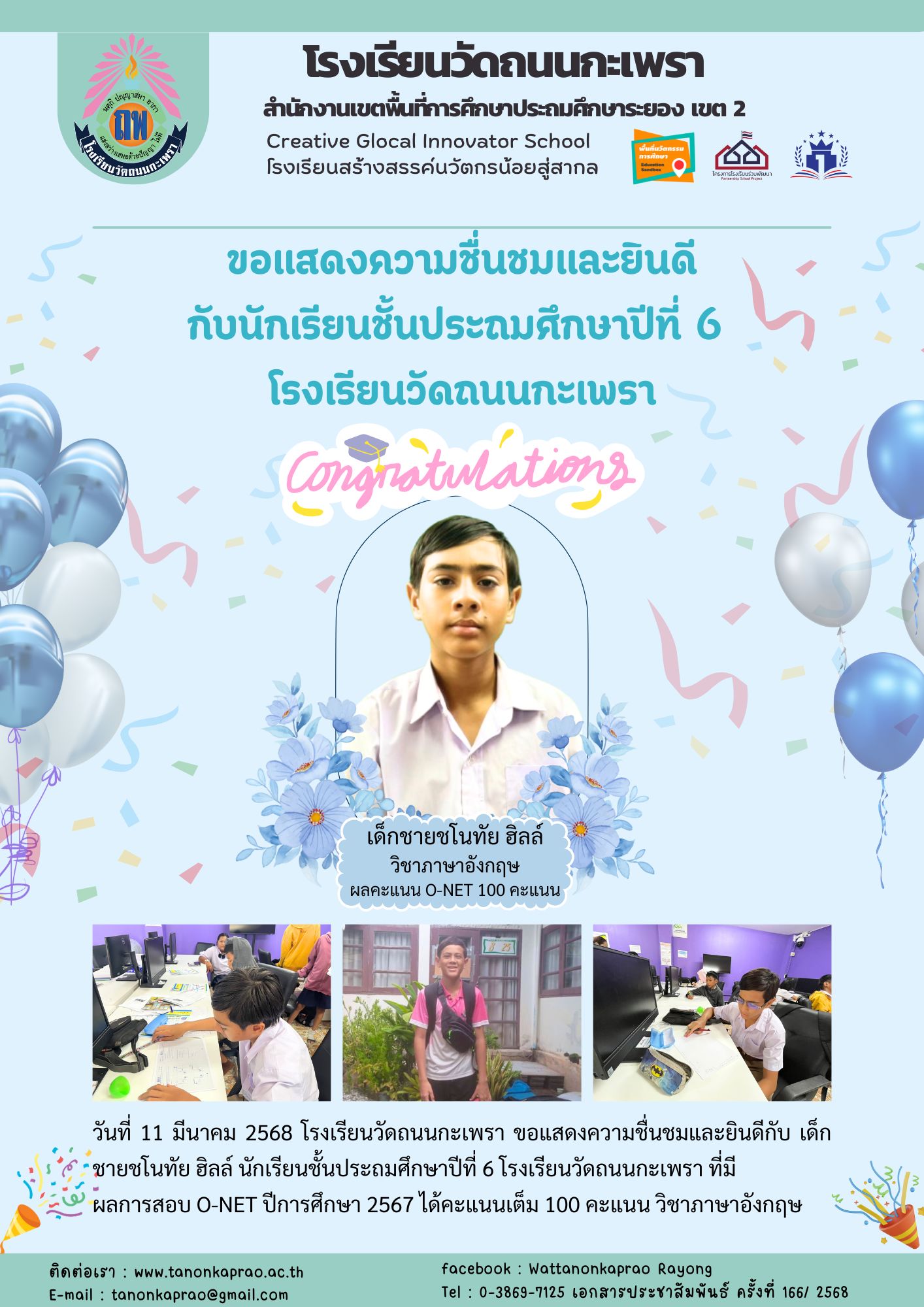 วันที่ 11 มีนาคม ขอแสดงความชื่นชมและยินดี กับนักเรียนชั้นประถมศึกษาปีที่ 6 โรงเรียนวัดถนนกะเพรา