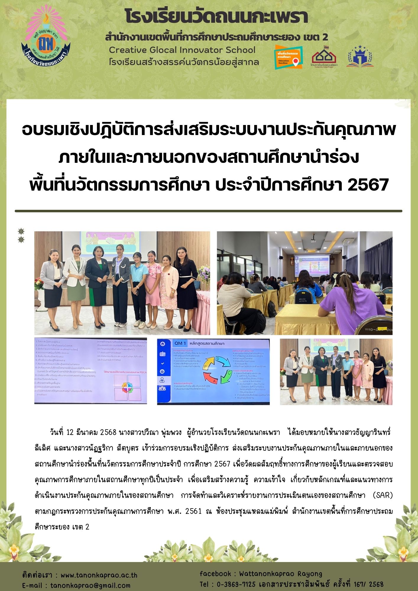 วันที่ 12 มีนาคม อบรมเชิงปฏิบัติการส่งเสริมระบบงานประกันคุณภาพภายในและภายนอกของสถานศึกษานำร่อง พื้นที่นวัตกรรมการศึกษา ประจำปีการศึกษา 2567
