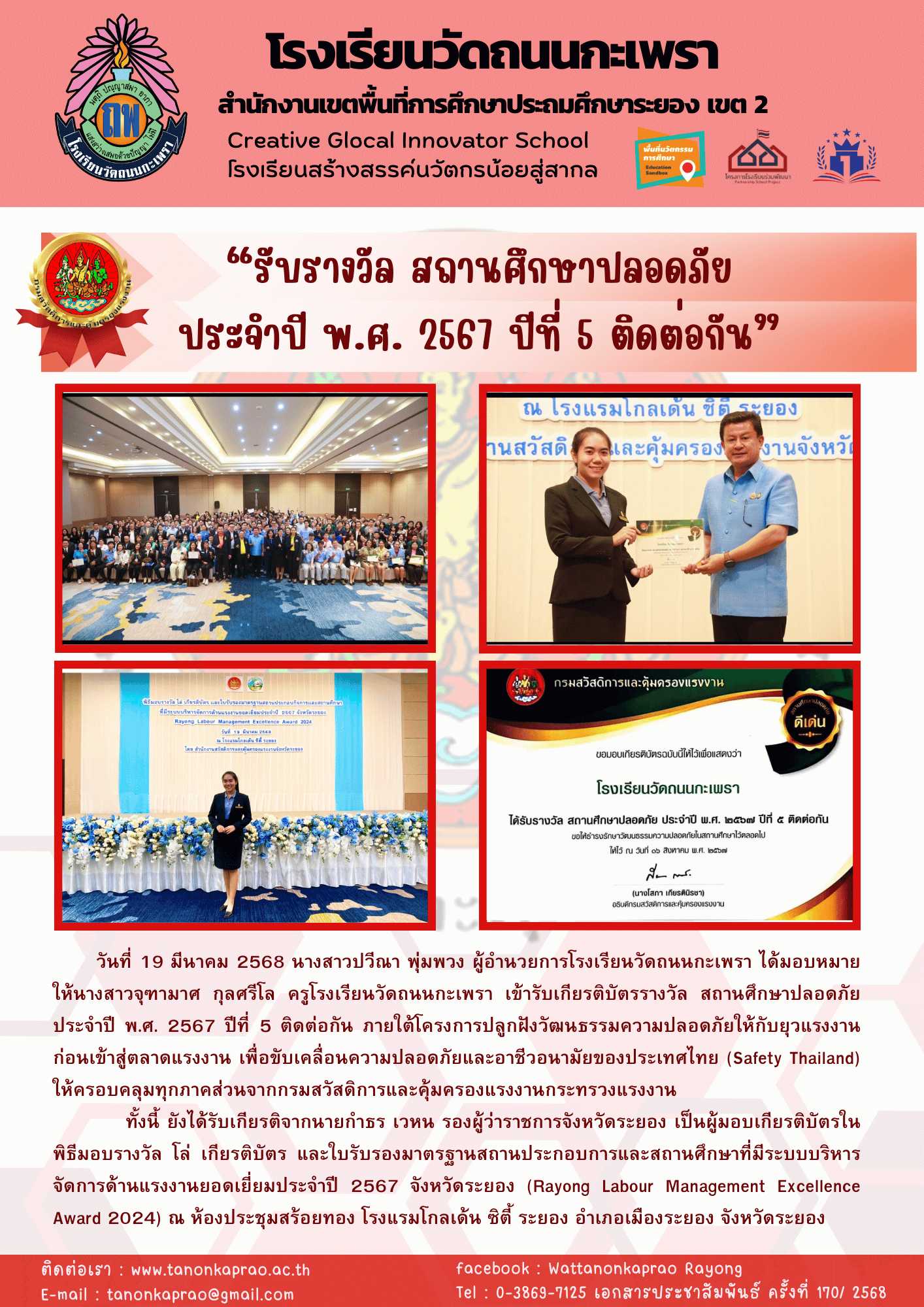 วันที่ 19 มีนาคม 2568 รับรางวัลสถานศึกษาปลอดภัย ประจำปี 2567 ปีที่ 5 ติดต่อกัน