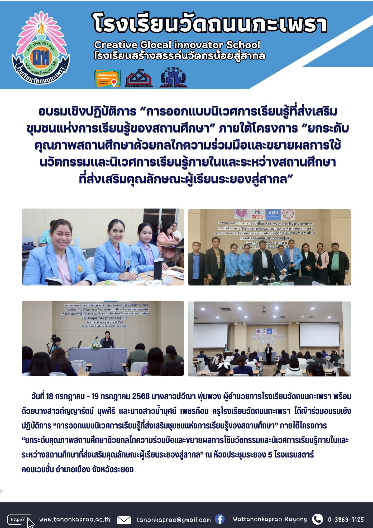 วันที่ 18 - 19 กรกฎาคม 2568 อบรมเชิงปฏิบัติการ “การออกแบบนิเวศการเรียนรู้ที่ส่งเสริม ชุมชนแห่งการเรียนรู้ของสถานศึกษา” ภายใต้โครงการ “ยกระดับคุณภาพสถานศึกษาด้วยกลไกความร่วมมือและขยายผลการใช้ นวัตกรรมและนิเวศการเรียนรู้ภายในและระหว่างสถานศึกษา ที่ส่งเสริมค