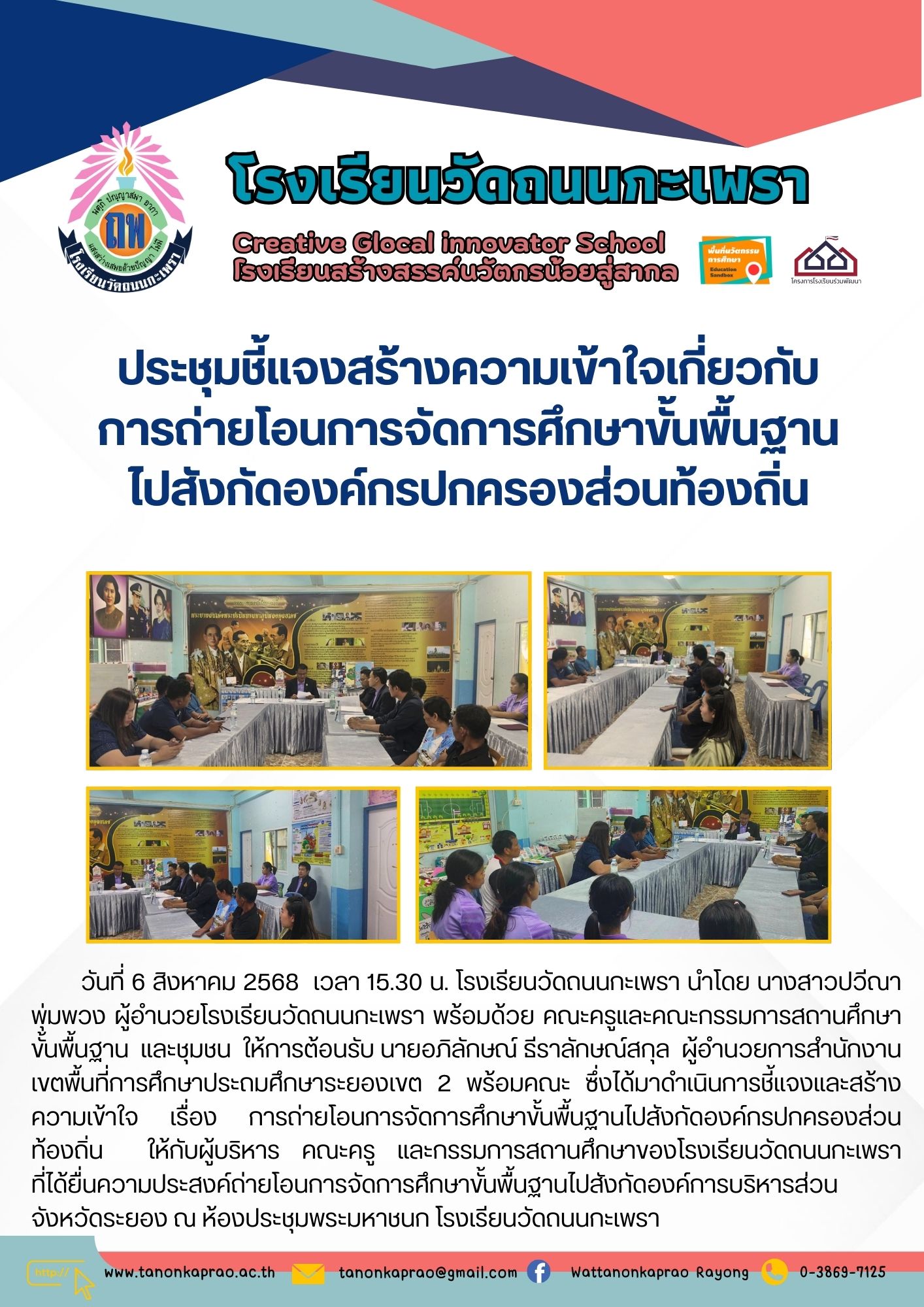 วันที่ 6 สิงหาคม 2568 ประชุมชี้แจงสร้างความเข้าใจเกี่ยวกับการถ่ายโอนการจัดการศึกษาขั้นพื้นฐาน ไปสังกัดองค์กรปกครองส่วนท้องถิ่น