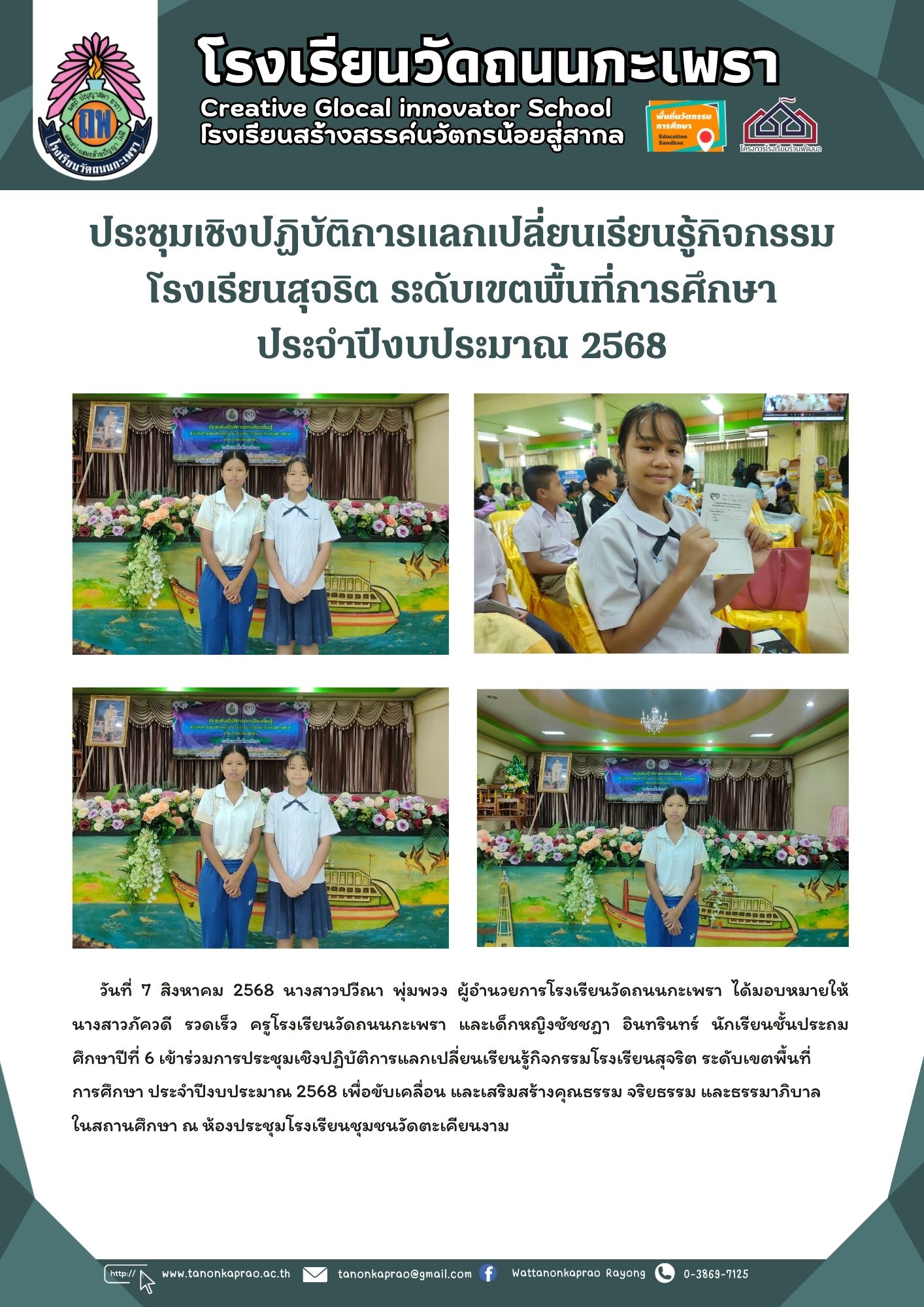วันที่ 7 สิงหาคม 2568 ประชุมเชิงปฏิบัติการแลกเปลี่ยนเรียนรู้กิจกรรมโรงเรียนสุจริต ระดับเขตพื้นที่การศึกษา ประจำปีงบประมาณ 2568