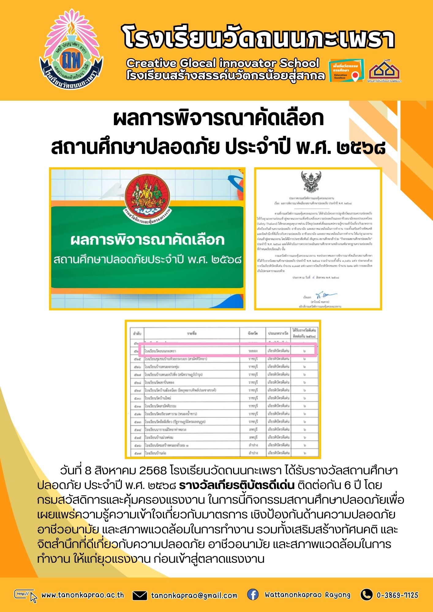 วันที่ 8 สิงหาคม 2568 ผลการพิจารณาคัดเลือก สถานศึกษาปลอดภัย ประจำปี พ.ศ. ๒๕๖๘