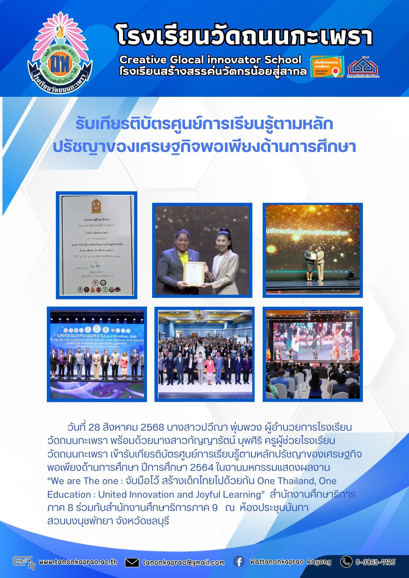 วันที่ 28 สิงหาคม 2568 รับเกียรติบัตรศูนย์การเรียนรู้ตามหลัก ปรัชญาของเศรษฐกิจพอเพียงด้านการศึกษา